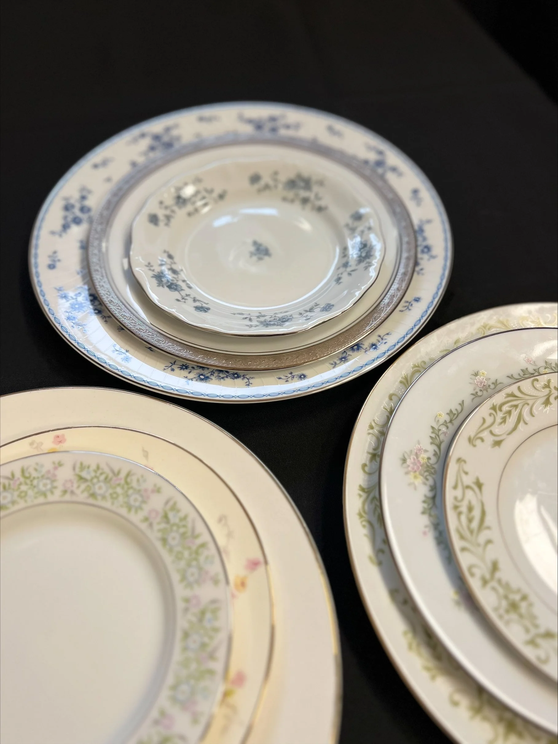 Add some character to your tables with the addition of our mix and match vintage china dinner plates. We have a variety of patterns and color that can be tailored to your event.